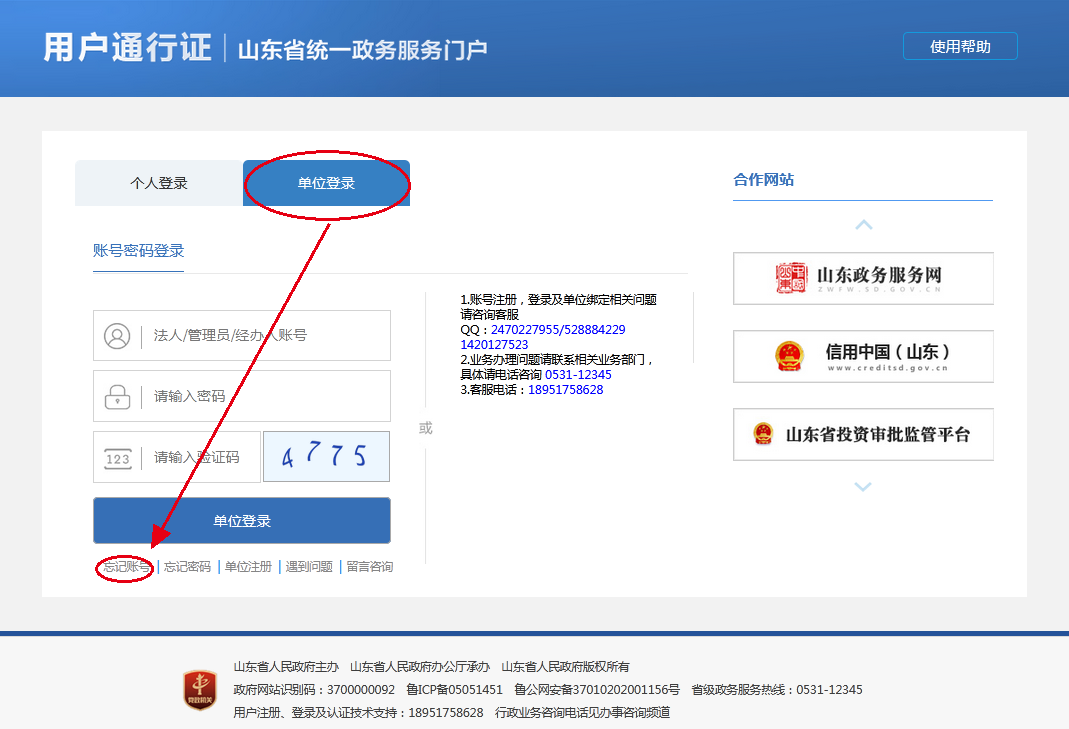 1.单位用户在政务服务网注册过单位账号,忘记登录账号(登录名),可在浏览器中输入山东政务服务网网址http://whzwfw.sd.gov.cn/wh/public/index,打开网站后点击页面右上角的“登录”按钮,在账号登录页面选择“单位登录”,然后选择“忘记账号”。 (注意:单位账号找回只能找回单位账号(即法人账号),管理员和经办人的账号需要单位账号登录后在单位空间中查看)