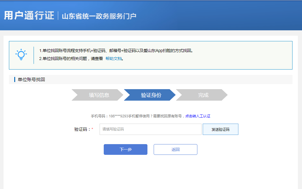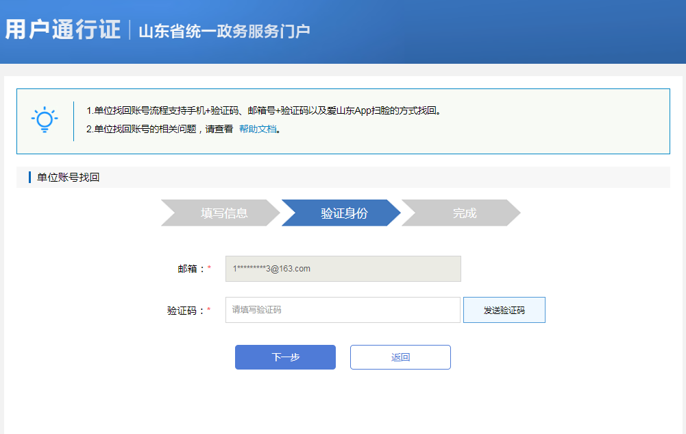 3.在验证身份环节涉及到三种验证方式:手机号+验证码方式、邮箱+验证码方式、爱山东APP扫脸认证,用户可自由选择。