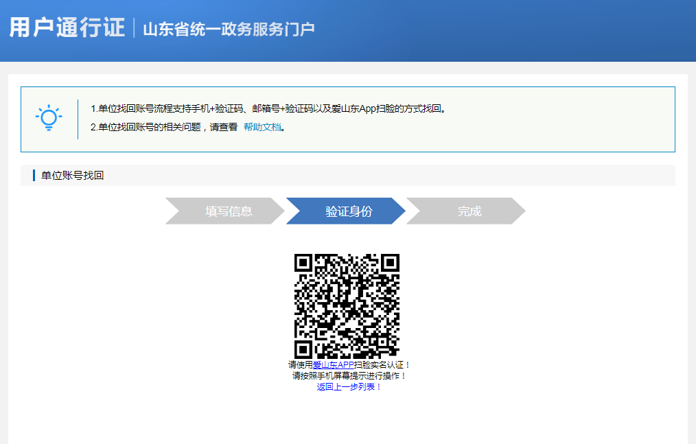 3. 在验证身份环节涉及到三种验证方式:手机号+验证码方式、邮箱+验证码方式、爱山东APP扫脸认证。