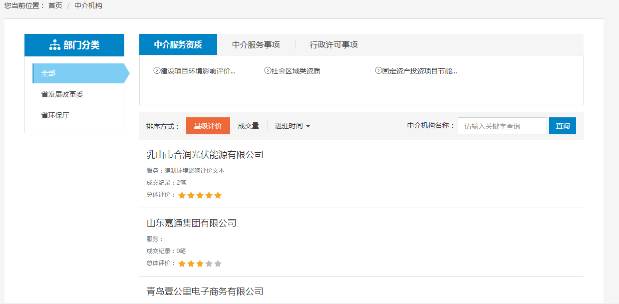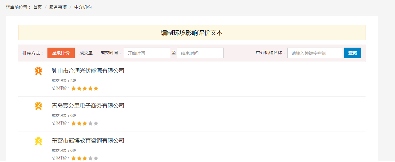 首页上“服务评级”栏目展示六个评分最高中介机构名称,点击更多,展示所有中介机构的星级排行榜,并提供星级评价、成交量、成交时间三种排序方式(如图4)。