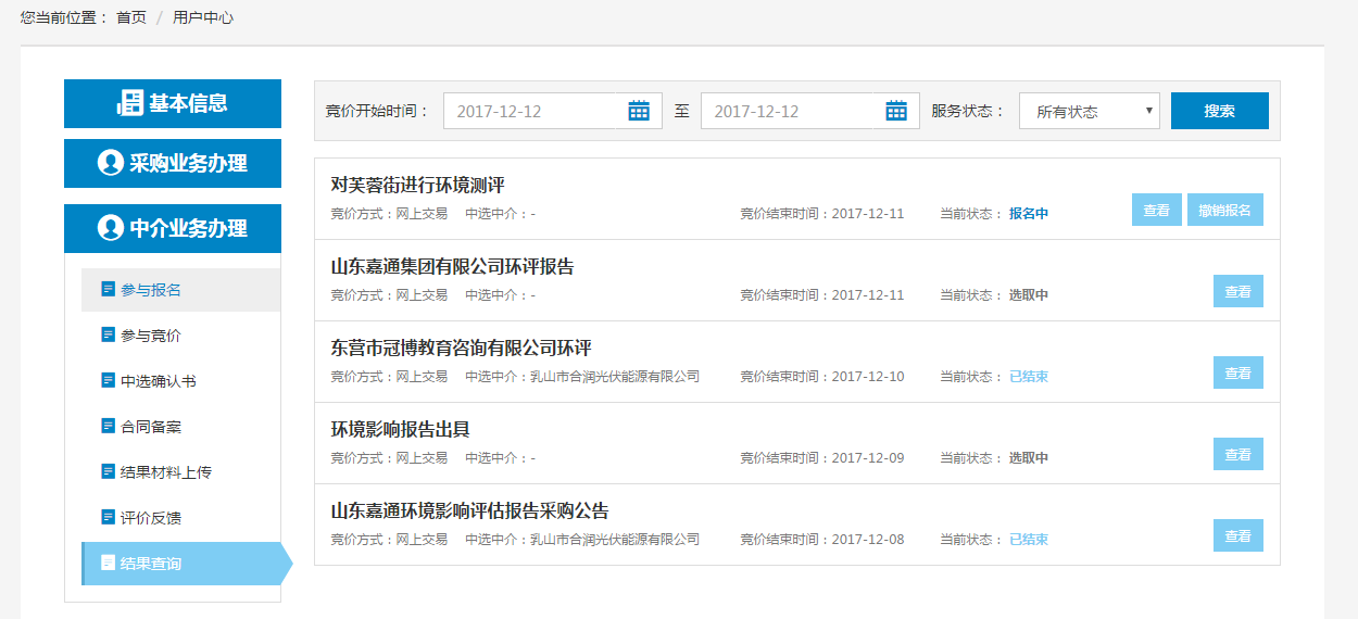 采购人和中介服务机构可以通过“提交”快捷按钮对处于报名中、竞价中以及成交信息进行查看,查询时可以通过项目名称、行政区划、事项名称进行查询(如图12)
