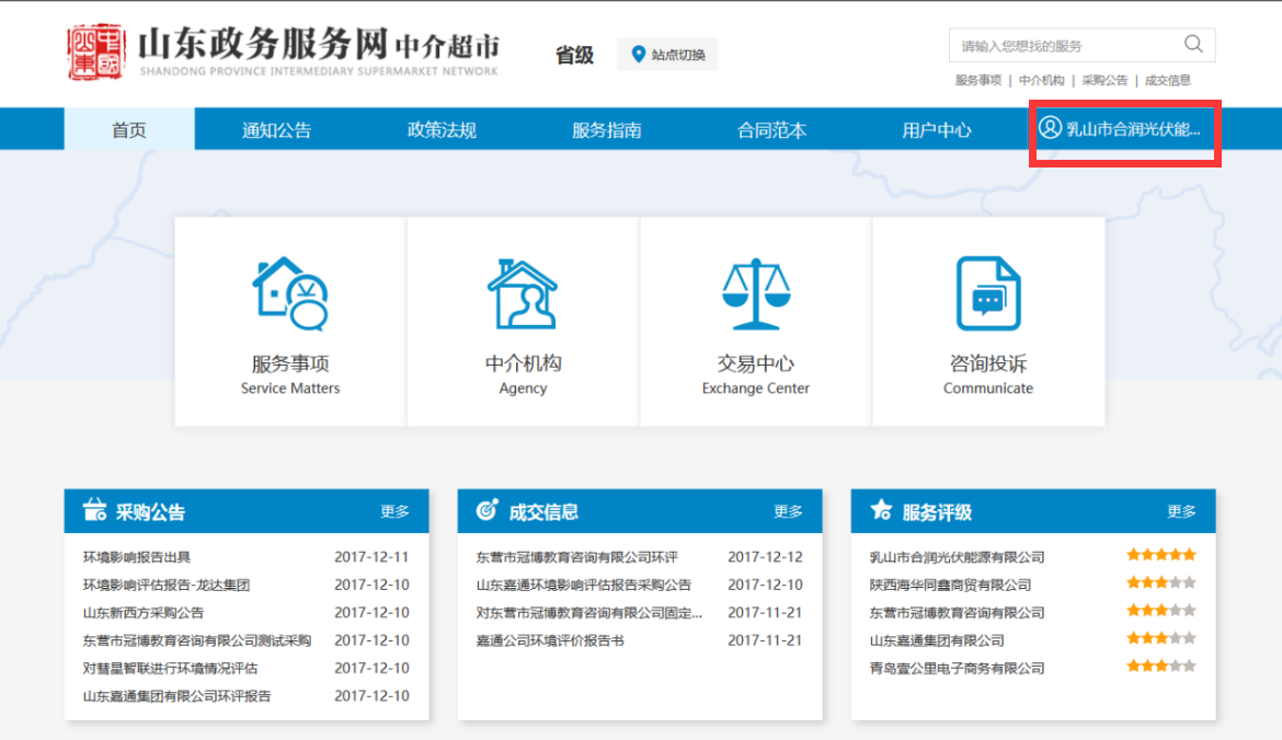 首先是导航栏,放置“通知公告”“政策法规”“服务指南”“合同范本”四个信息类的功能以及公众登录进行操作的“用户中心”。